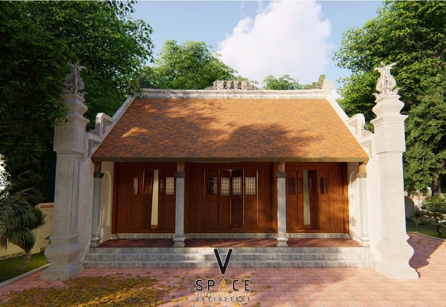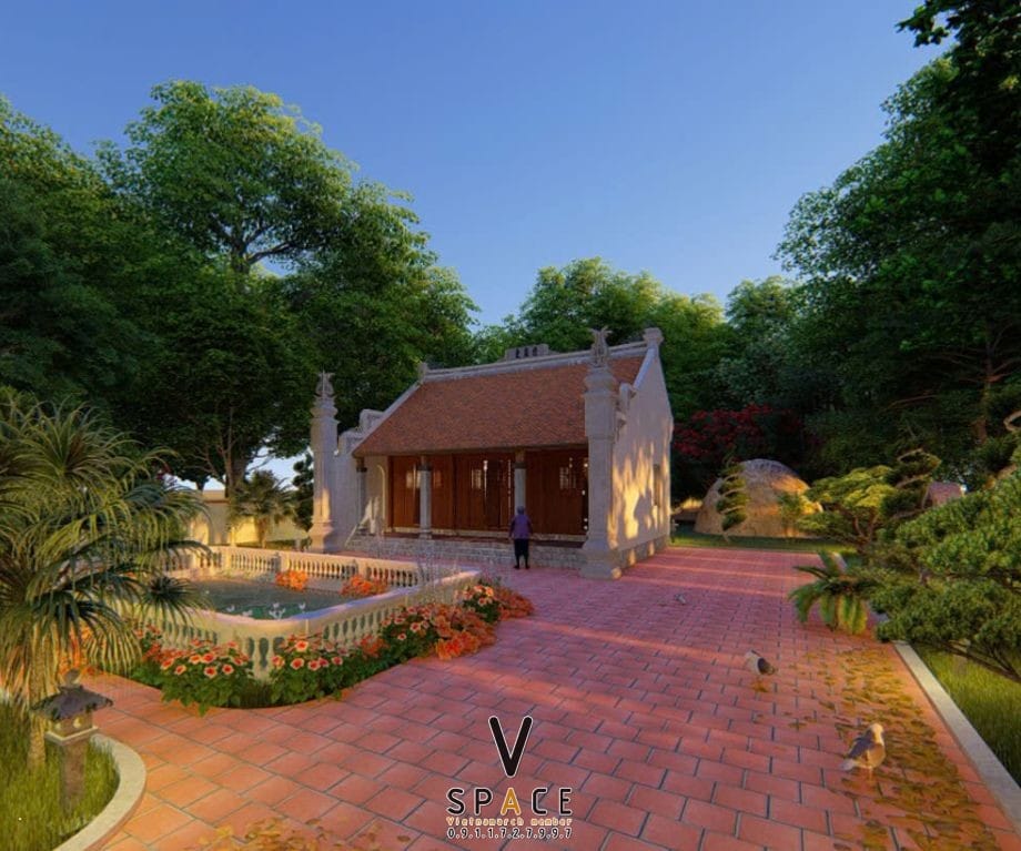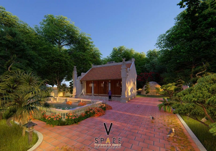 Phương án thiết kế nhà thờ họ 3 gian 2 mái 63m2 có hồ nước nên thơ tại Ninh Bình